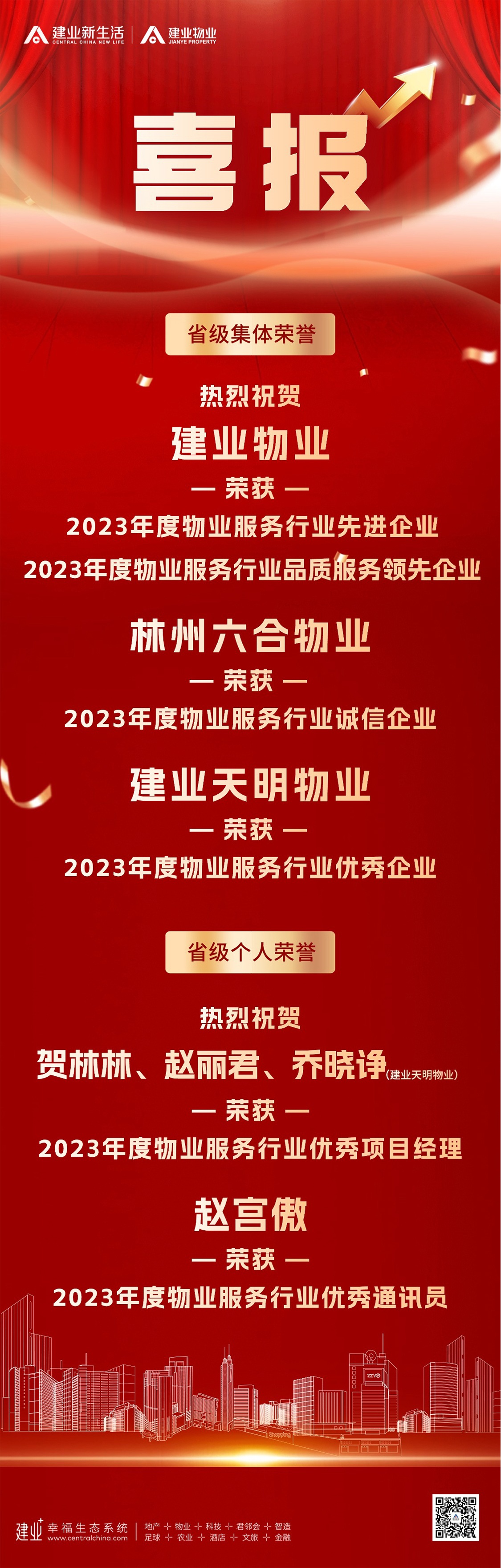 近日,建業(yè)物業(yè)及子公司林州六合物業(yè)、建業(yè)天明物業(yè)連續(xù)榮獲多項集體榮譽及個人榮譽,充分體現(xiàn)了市場、行業(yè)與業(yè)主對建業(yè)物業(yè)的認可與肯定。