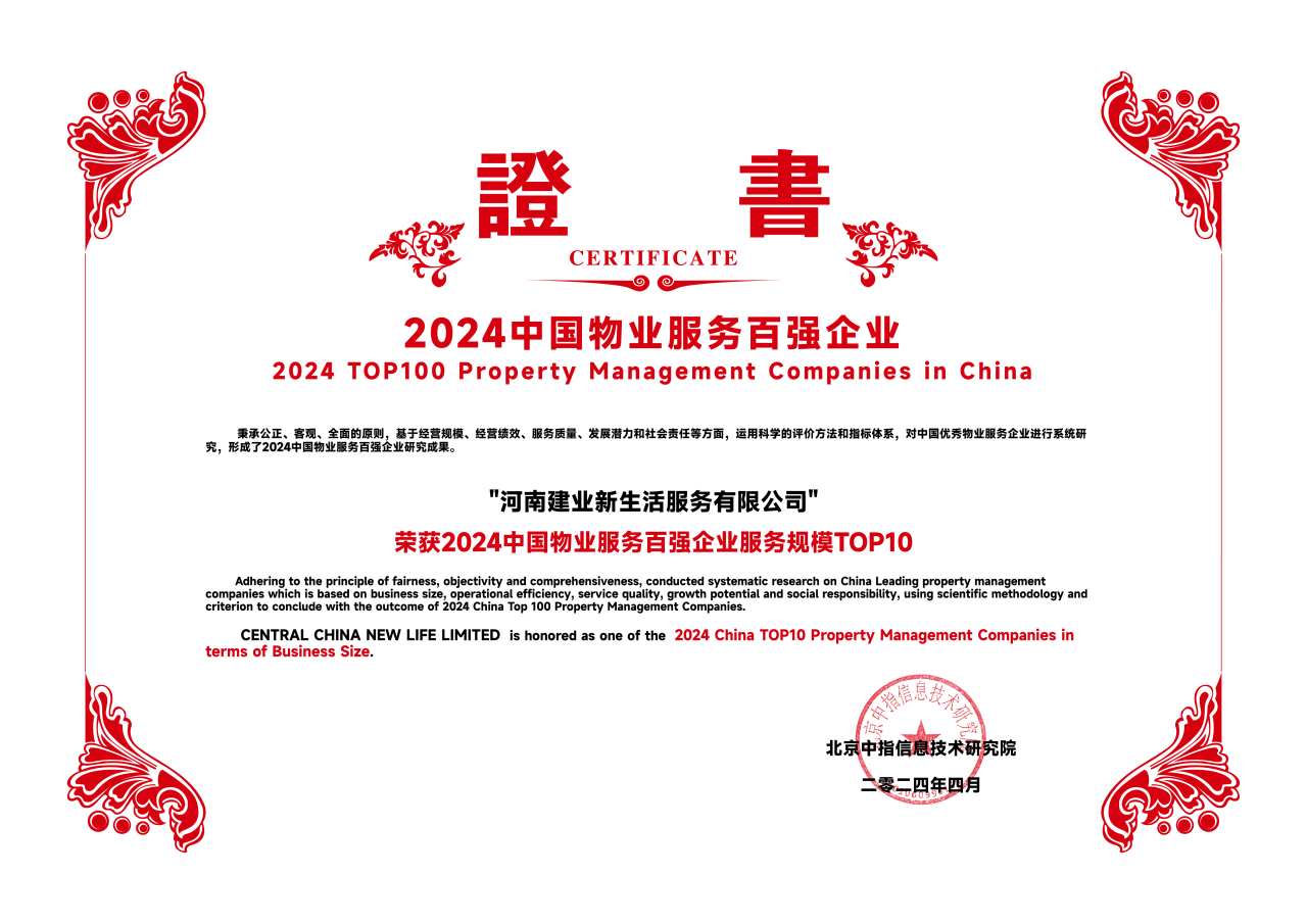 418日,由中指研究院、中國(guó)房地產(chǎn)TOP10研究組主辦的“2024中國(guó)物業(yè)服務(wù)百?gòu)?qiáng)企業(yè)研究成果會(huì)在北京舉行。建業(yè)新生活以其卓越的服務(wù)品質(zhì)和持續(xù)的業(yè)務(wù)創(chuàng)新,蟬聯(lián)“2024中國(guó)物業(yè)服務(wù)百?gòu)?qiáng)企業(yè)11位、“2024中國(guó)物業(yè)服務(wù)百?gòu)?qiáng)企業(yè)服務(wù)規(guī)模TOP10”,同時(shí)榮獲“2024中國(guó)物業(yè)服務(wù)百?gòu)?qiáng)企業(yè)成長(zhǎng)性領(lǐng)先企業(yè)TOP5”稱號(hào)。