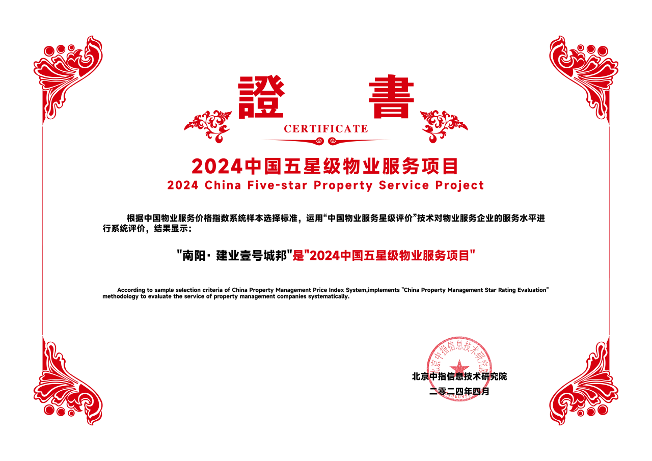 同時(shí),建業(yè)新生活旗下在管項(xiàng)目鄭州·建業(yè)海馬九如府、南陽(yáng)·建業(yè)壹號(hào)城邦榮獲“2024中國(guó)五星級(jí)物業(yè)服務(wù)項(xiàng)目稱號(hào)。