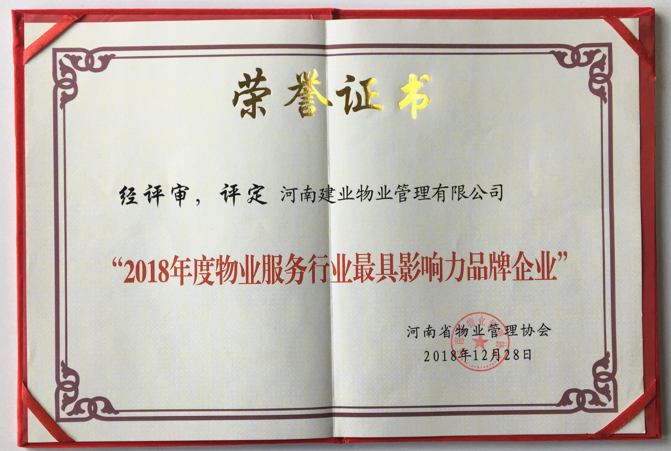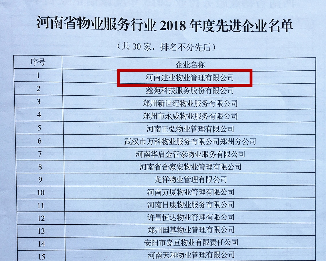 建業(yè)物業(yè)喜獲河南省物業(yè)服務行業(yè)2018年度先進企業(yè)及最具影響力品牌宣傳企業(yè)稱號