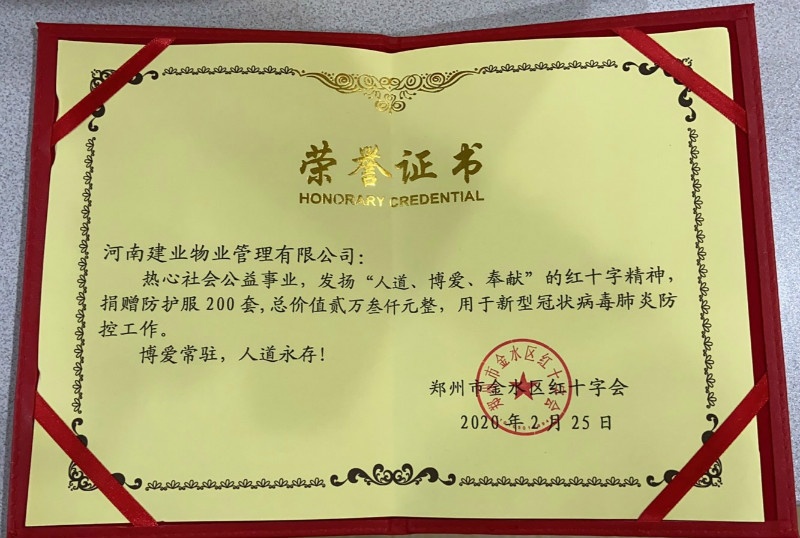 守望相助,共克時艱 | 建業(yè)物業(yè)向鄭州市金水區(qū)紅十字會捐贈防護服200套