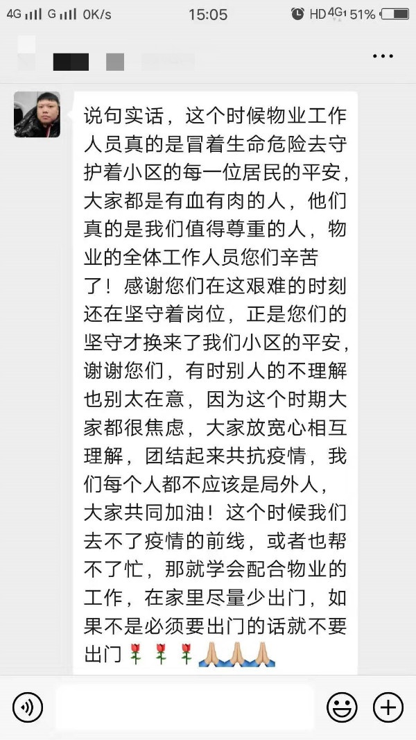 一位建業(yè)業(yè)主,同時(shí)也是集團(tuán)高層領(lǐng)導(dǎo),當(dāng)她看到奮戰(zhàn)在一線、可敬又可愛的建業(yè)物業(yè)人,每天每一時(shí)刻用血肉之軀,筑起業(yè)主安全的長(zhǎng)城時(shí),特別感動(dòng)、特別感謝,多次流下眼淚,特發(fā)來(lái)2萬(wàn)元紅包給一線的物業(yè)員工,助力物業(yè)防疫工作的進(jìn)行!