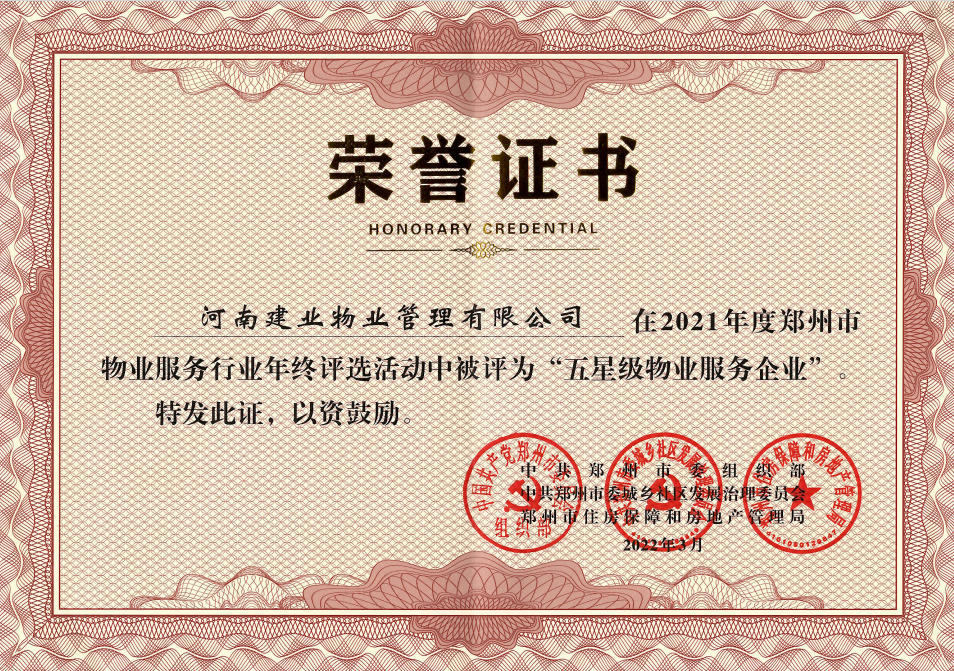 恒守初心,載譽(yù)而行 ——建業(yè)物業(yè)斬獲2021年度鄭州市“五星級(jí)物業(yè)服務(wù)企業(yè)”榮譽(yù)稱號(hào)