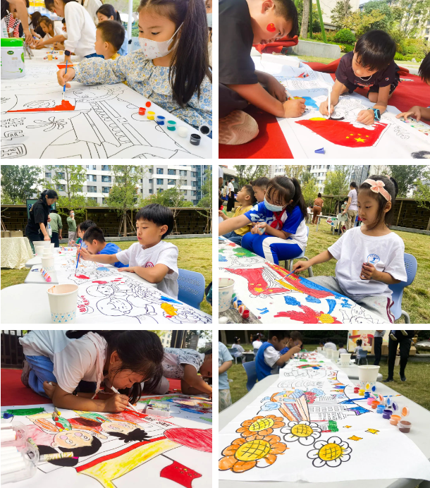 一幅百米畫卷由小業(yè)主們合力完成,作為獻給祖國的最好禮物。他們涂抹出多彩的圖案,也描繪著祖國美好的未來,小業(yè)主們用剪紙手工制作花環(huán),表達著自己對祖國的熱愛。擅長書法的業(yè)主們,用遒勁有力的筆觸,書寫著對祖國母親的深深情懷。