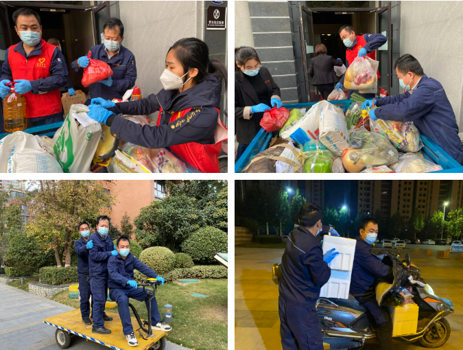 因?yàn)橐咔楣芸兀?1號樓1單元的122戶業(yè)主被封控在家。他們一戶戶統(tǒng)計(jì)業(yè)主物資需求,統(tǒng)一進(jìn)行購買和配送。物資到位后,他們又全員上陣,先按照樓層進(jìn)行分類,再由5名維修工穿著密不透風(fēng)的防護(hù)服,一趟趟地穿梭在小區(qū)里。為了提高效率,三輪車、電動車都被利用起來,只為盡早將物資運(yùn)送到業(yè)主手中。