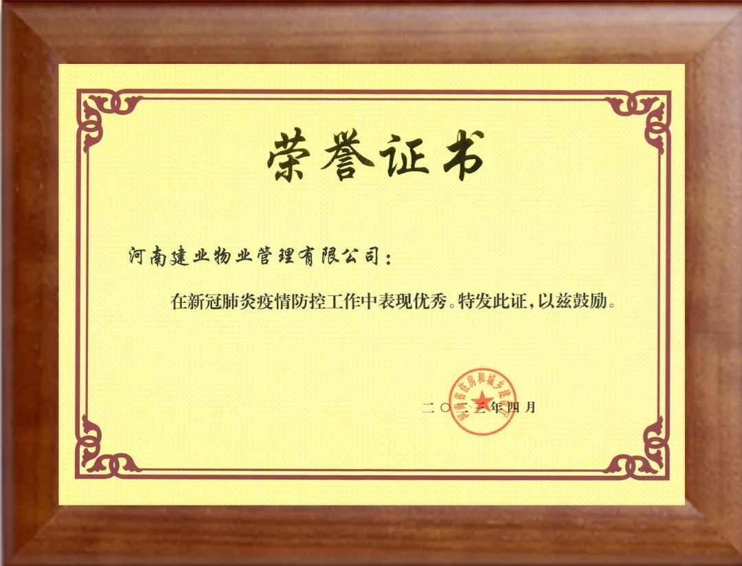 近日,因在過去三年的新冠肺炎疫情防控工作中表現(xiàn)優(yōu)秀且作出突出貢獻,建業(yè)物業(yè)獲得由河南省住房和城鄉(xiāng)建設(shè)廳頒發(fā)的榮譽證書。